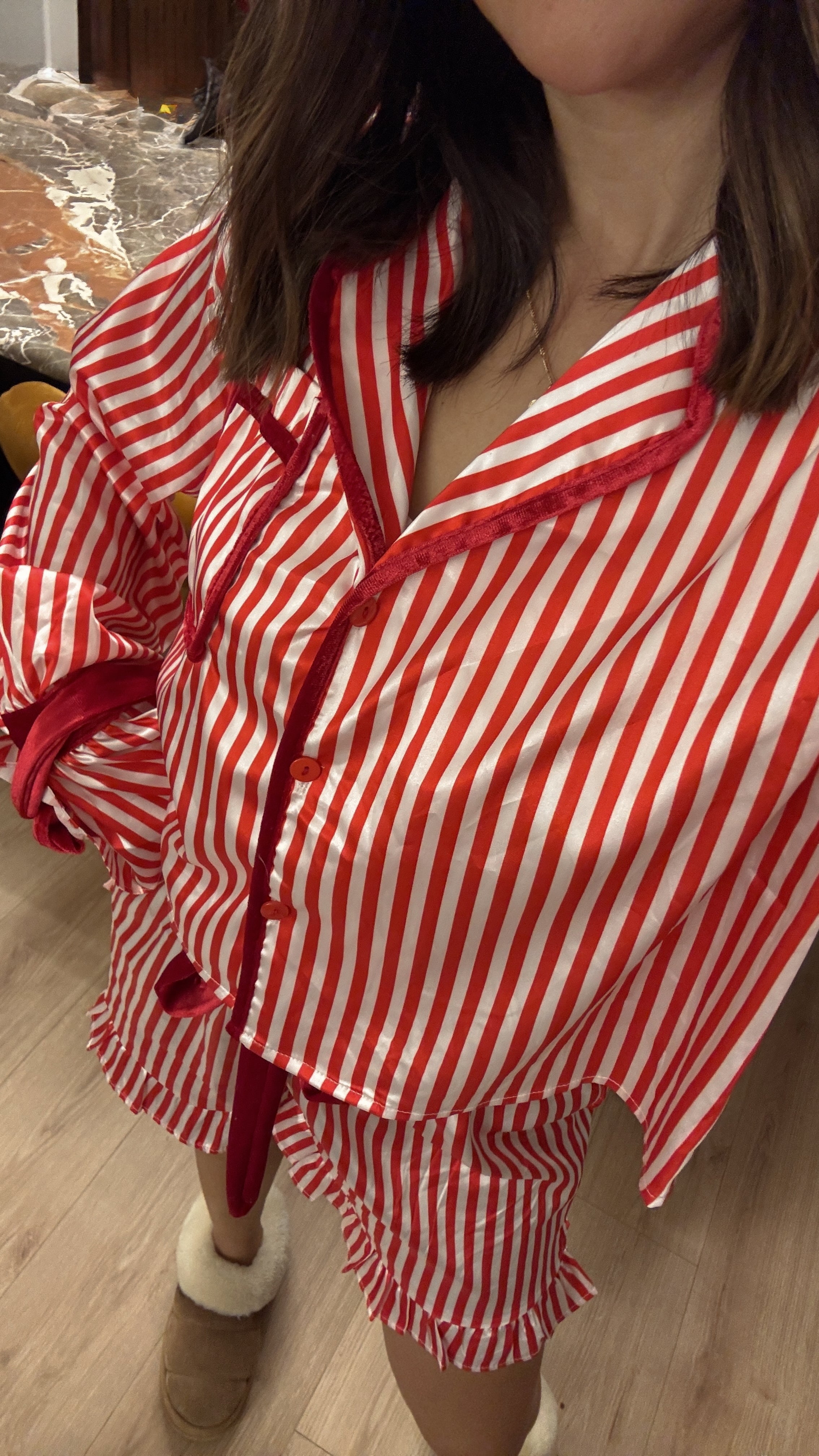 Get into the holiday spirit with our Candy Cane Pjs! These festive pajamas will bring a touch of sweetness to your sleepwear game. Made with a silky and comfortable material, you'll feel like you're snuggled up with a big bowl of candy canes. Perfect for cozy nights in and making memories with loved ones.